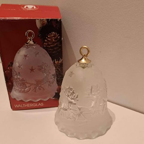Den viste glasklokke har en dekorativ form med blomstermotiv og grønne bånd. Den er fremstillet af klart glas og har en ringeklokke indeni, som kan ses fra bunden. Den kommer i sin originale emballage fra mærket Walther-Glas.