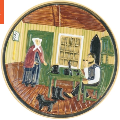 En keramisk vægplatte med en diameter på 15,5 cm. Platte fremstiller en tegneserie-motiv med to siddende figurer med stokke og en fugl på en gren bag dem. Der er tekst nederst, som leder til humoristisk dialog. Bagsiden af platte viser mærkninger, inklusive 'Made in Denmark', og det har en snor til ophængning.