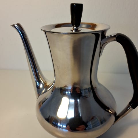 Dette er en vintage sølvkande med en høj, elegant silhuet og et buet hank design. Kanden har en hamret overfladestruktur, hvilket tilføjer karakter til dens udseende. Den er 22 cm høj, og låget har en rund knop. Bunden af kanden viser et indgraveret '40', muligvis angivet vægt eller kapacitet. Kanden er lavet af blankt metal, som ser ud til at være sølv eller forsølvet metal. Den har et klassisk udseende og kan anvendes som en pyntegenstand eller til servering af varme drikke.