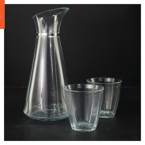 Dette er en glaskaraffel med en diameter på 7,5 cm og en længde på 26 cm. Karaffelen er lavet af klart glas og har en simpel, elegant form. Den har en sølvfarvet kant omkring midten, der tilføjer en moderne touch til dens design. Glasset ser ud til at være af høj kvalitet og egner sig til servering af vand eller andre drikkevarer. Bunden har et indpræget symbol, der kan indikere et brand eller producentens mærke. Tags: glaskaraffel, servering, moderne.