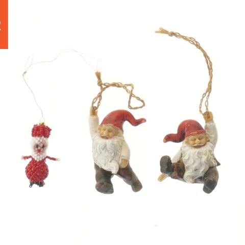 Denne samling består af to hæklede nisser med røde huer og skæg, samt en håndfuld julepynt. De hæklede nisser har grå kroppe og røde hatte, og detaljerne inkluderer små ansigter med skæg og huer. Der er også flere pyntede ornamenter formet som hjerter med rødt og grønt blomstermønster, bundet sammen med røde snore. Desuden inkluderer samlingen nogle dekorative juleelementer og en lille dukke.