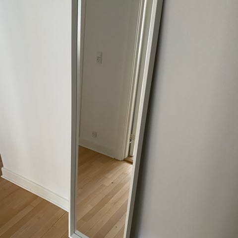 IKEA NISSEDAL spejl med malet lyserød ramme. Kan hænges både vertikalt og horisontalt.