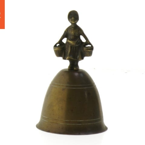 En blå porcelænsklokke med håndtag og malet motiv af landskab, inkluderet et træ og et hus. Klokken er 14 cm høj og har en klokkeklangmekanisme indeni. Toppen af klokken har en lille guldfarvet detalje. Klokken har en dekorativ rolle og kan bruges som pyntegenstand.