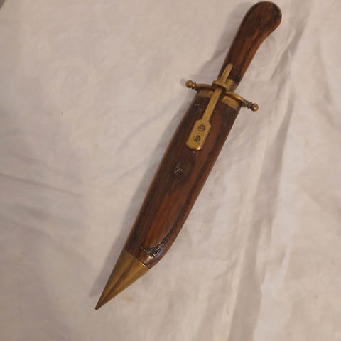 Denne genstand er en traditionel dolk, fuldstændig dækket af detaljeret graveringer, der giver et autentisk og kulturelt udseende. Dolken kommer med en skede, der også er udsmykket med et smukt, komplekst mønster. Begge dele har et indviklet design og ser ud til at være lavet af metal, sandsynligvis af sølv eller forsølvet materiale. Størrelsen af dolken er cirka 19 cm i længden. Den har en kurvet form, typisk for traditionelle dolke, og er ideel som en dekorationsgenstand.