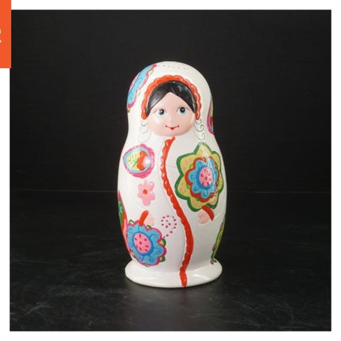 Denne nye dekorative porcelænssparebøsse er formet som en matryoshka dukke og har flerfarvet stribemønster med en primært blå top. Den er fremstillet af keramik og kan opdeles i to separate dele, hvilket gør den ideel til opbevaring af små genstande. Dimensionerne er omkring 20 cm i højde.