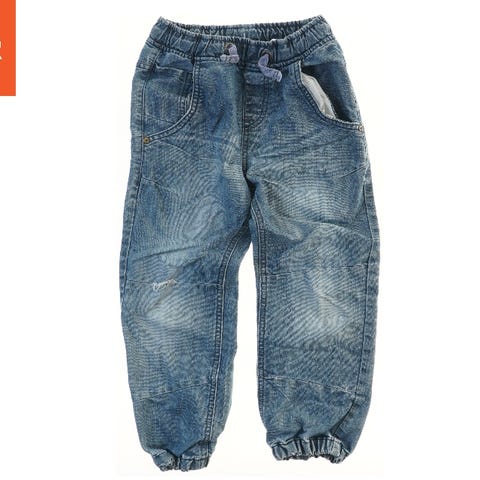 Par blå jeans bukser designet til børn. De har elastik i taljen og ved anklerne for mere fleksibilitet. Foran har bukserne to skrå lommer med hvid kant, og bagpå er der to påsatte lommer. Materialet har en denim look.