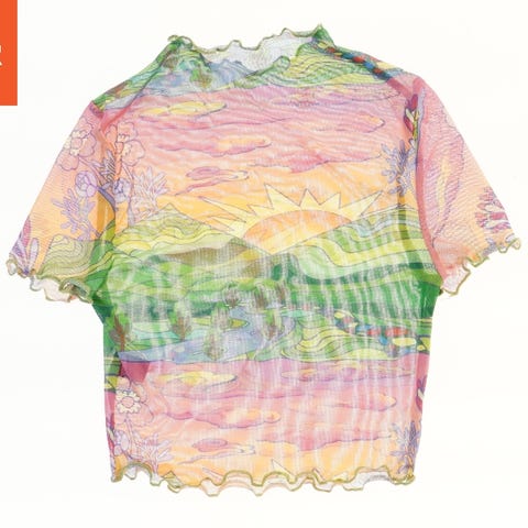 Ærmeløs tanktop med et farverigt sommerfugleprint. Blusen har en lys baggrund med små sommerfugle i forskellige farver som lyserød, blå, lilla, gul og orange fordelt over hele stoffet. Den har en enkel halsudskæring med en lille sløjfe foran.