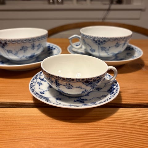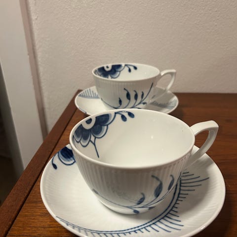 Dette sæt består af en tekop og en tilhørende underkop fra Royal Copenhagen. Tekoppen og underkoppen er lavet af hvid porcelæn med blå blomstermotiv. Både koppen og underkoppen har på bagsiden stemplerne 'Royal Copenhagen' og 'Handpainted'. Der er også en malerinitial 'LRX'. Koppen har en diameter på 10 cm, mens underkoppen har en diameter på 16 cm.