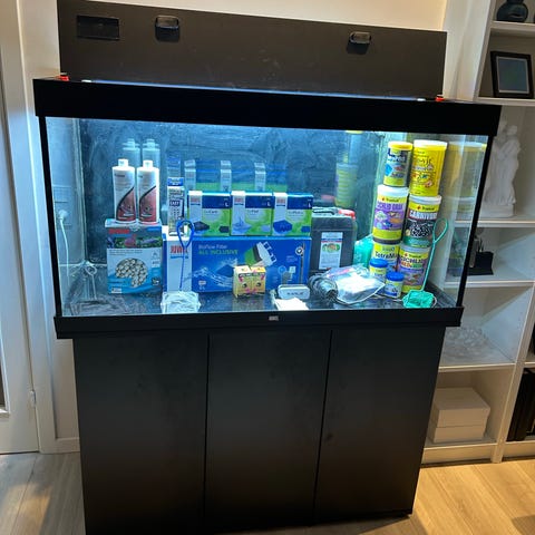Juwel Rio 180 i grå med underskab og JBL CristalProfi Greenline e1502. Der er sort folie som baggrund. God og pæn stand.