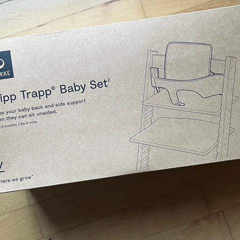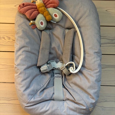 Stokke tripp trapp newborn set med gråt betræk og legestativ/stang. Har justerbare seler for sikkerhed og komfort. Betrækket er lavet af stof i grå farve og kan aftages til rengøring. Stolens design sikrer god støtte til barnet under måltider og aktivitet. Afhentes i Smørum.