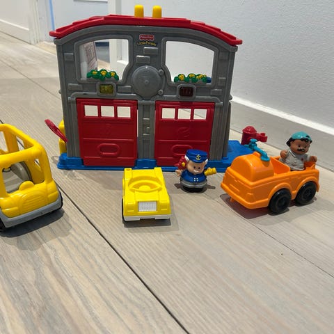 Fisher-Price Little People legetøjssæt med vej, bygninger og forskellige figurer. Indeholder en rundkørsel, flere små bygninger, køretøjer og figurer til leg. Materiale og størrelse ikke specificeret. Velegnet til børn til rolleleg og motorisk udvikling.