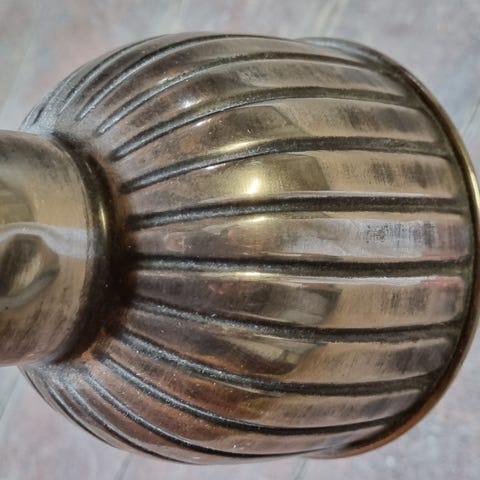 Bordlampe af messing og gyldent metal med kanneleringer og spiralformet beslag, europæisk lampeproducent, 1900-tallets første halvdel. Med original sortbrun fatning, ledning og stik. Tilsvarende netop solgt på auktion til 800,- Her hos mig kun 550,- Lys, plisseret lampeskærm fra Lene Bjerre kan medfølge. Denne dog naturligvis af væsentlig nyere dato. Fra ikkerygerhjem uden husdyr. Kan sendes eller afhentes i Nørresundby. Rabat gives gerne ved køb af flere af mine annoncer