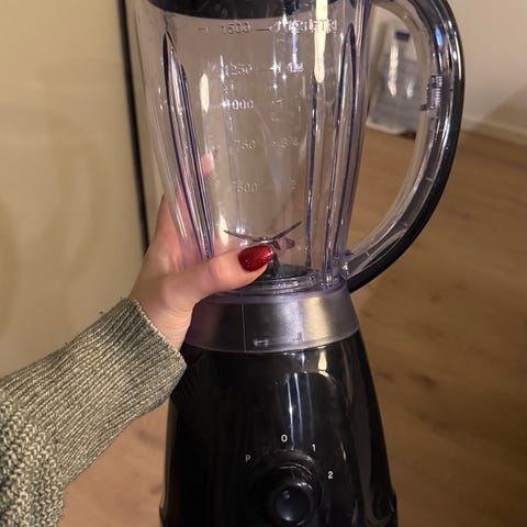Molino X Smoothie blender med flere plastbeholdere, låg, filterdele og farvede ringe til tilpasning. Blenderen har en sort og rød krop med elektrisk ledning. Komponenterne er designet til at blande og filtrere smoothies og andre drikkevarer.