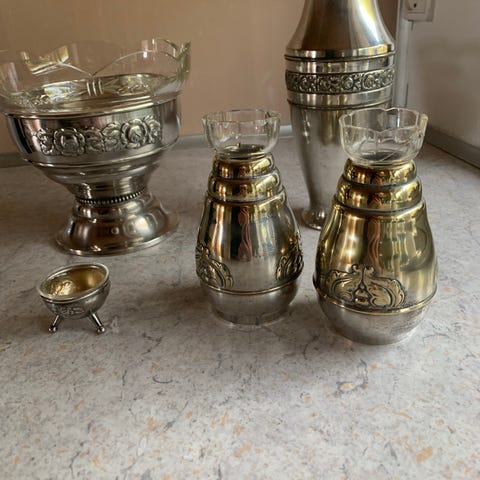 En vase 150kr. En del sølv afskallet men rigtig fin .