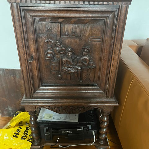 Træskab med dør, måler ca. 50cm i bredden og 56 cm i højden. Skabet er lavet i træ og har en enkel, naturlig finish. Døren er hængslet og kan åbnes for opbevaring indeni.