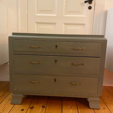 Fin gammeldags kommode. Den er nymalet og har fået matchende nye greb på. Den skal afhentes på Østerbro.