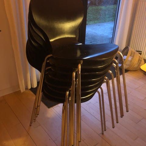 15 skal-stole (9 hvide og 6 sorte) sælges grundet flytning. Har tidligere været anvendt som ekstra stole i forbindelse med diverse private arrangementer. Er i fornuftig stand og klar til brug.