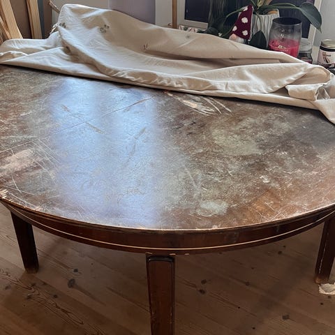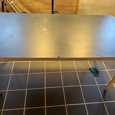 Hjemmelavet bord - plade af gl. skrivebord og ben lavet af bukke fra Ikea. Ben sidder inde under pladen, så de ikke generer. Har aldrig stået ude.