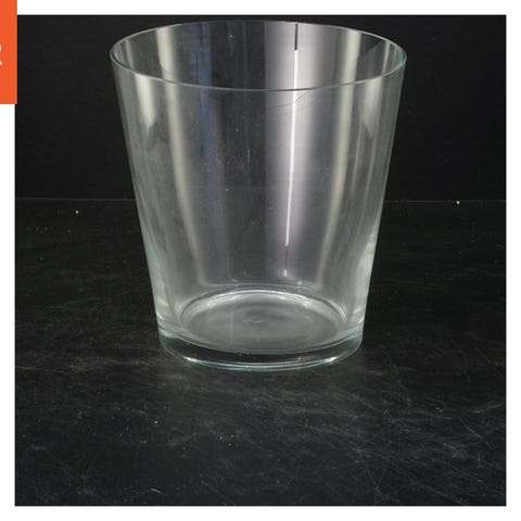 En glasvase med et dekorativt skåret mønster, hovedsageligt med blomster og geometriske former. Vasens form er bredere ved toppen og smalner ind mod bunden. Den er gennemsigtig og robust, egnet til brug som dekorativ indretning eller til at holde blomster. Størrelse: 18 cm i højde og 13 cm i diameter ved toppen.
