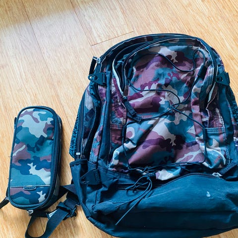 Satch rygsæk og penalhus i stofmateriale, designet til unisex brug. Sættet består af en rygsæk med flere rum og et matchende penalhus, begge med mønster i mørke og pink farver.