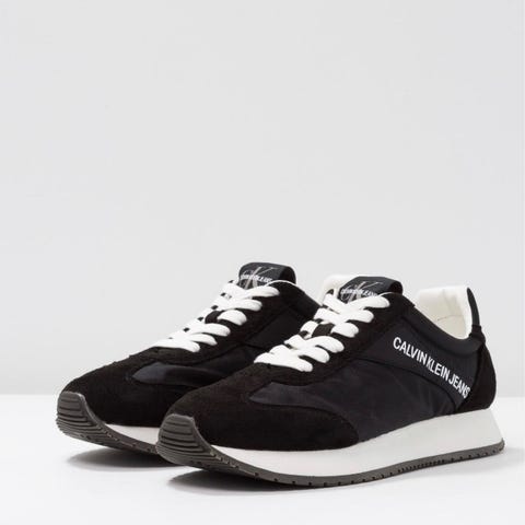 Dette er et par hvide Calvin Klein sneakers med snørebånd. Det har et Calvin Klein Jeans-logo på ydersiden af skoen og på sålen. Sålen har et prikket mønster og sorte gummidele for bedre greb. Størrelsen på skoene er 38.