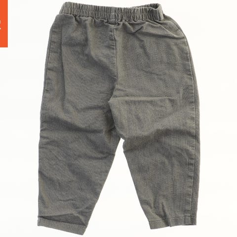 Par beige bukser med knaplukning og lynlås foran. Bukserne har lommer på både forsiden og bagsiden. Der er sorte synlige stikninger som kontrastdetaljer på lommerne og langs kanten.