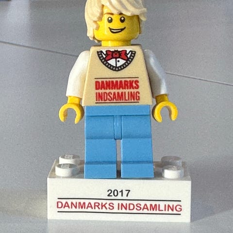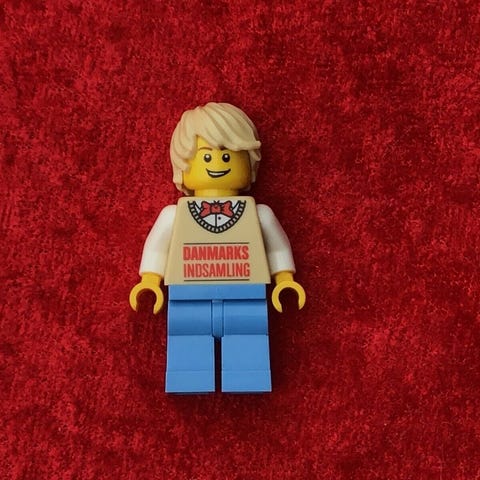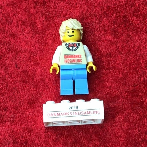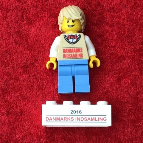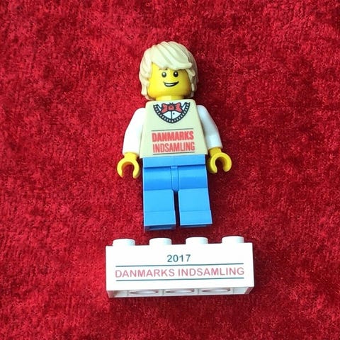 Figuren kan hentes i Skævinge eller København Lego figur fra Danmarks Indsamlingen