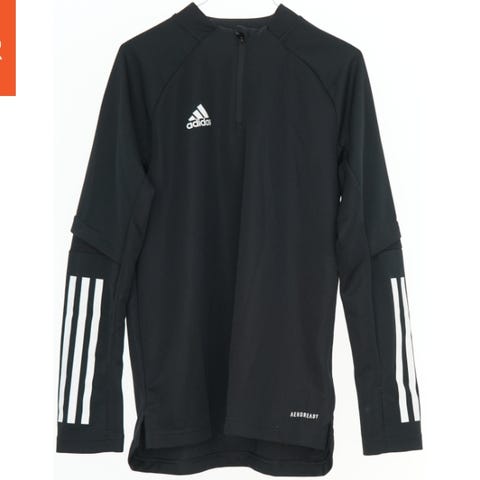 Sort Adidas træningstrøje med lynlås i front. Trøjen har lange ærmer med Adidas' karakteristiske hvide striber på underarmene. Der er også et lille hvidt Adidas logo på brystet. Fremstillet med Aeroready teknologi for komfort under træning.