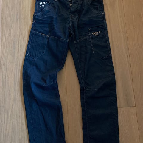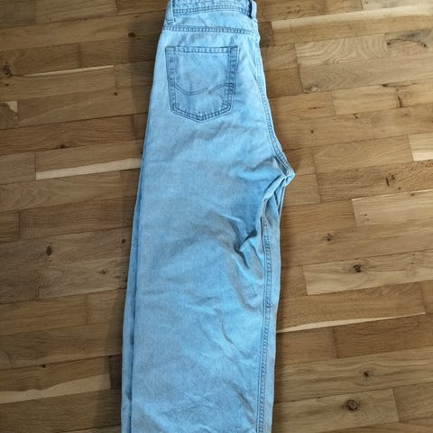 Et par lyseblå jeans med klassisk femlommedesign inklusive bæltestropper. Bagpå er der to påsatte lommer med dekorationer og et mærke med 'Jack & Jones'. Disse bukser er i størrelse 32.