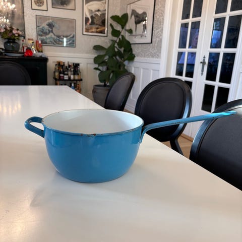 Blå emaljeret gryde med to håndtag, perfekt til madlavning og servering. Den har en diameter på 20 cm og er ideel til mindre retter. Gryden er lavet i Tjekkoslovakiet, hvilket giver den en unik charme og historie. Emaljeringen giver et klassisk udseende samtidig med at sikre god varmefordeling.