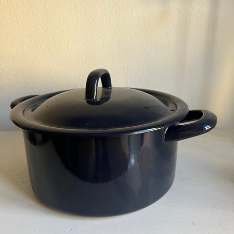 Blå emaljeret gryde med låg (str. 11x20 cm)