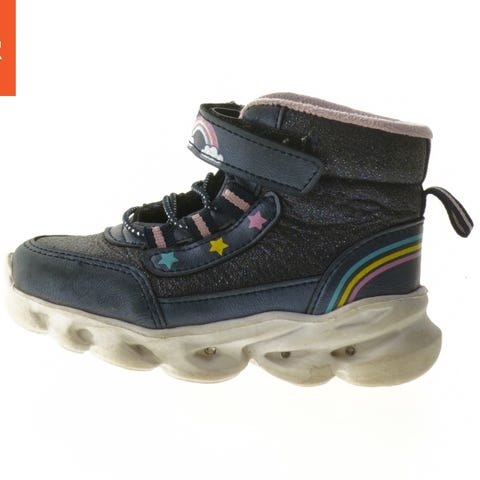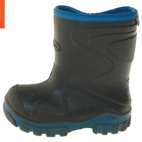 Børnestøvler i størrelse 21 med to velcro-lukninger for nem justering og komfort. Støvlens overdel er i en kombination af læder og tekstilmateriale, og den har en robust gummisål designet til godt greb. Indvendigt er støvlen foret med blødt fleece for ekstra varme og komfort. Støvlerne har detaljer som 'TEX' branding på siden, hvilket kan indikere vandafvisende materialer.