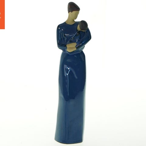 Den viste genstand er en lille figur fremstillet af porcelæn, formet som en baby med blå farve og små røde detaljer på hånden. Figuren er 6x5,5 cm stor og har en siddende position. Undersiden af figuren har et hul, der sandsynligvis er en del af fremstillingsprocessen eller design.