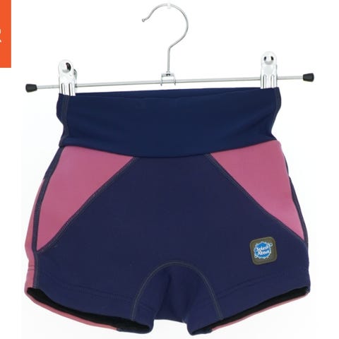 Et par røde badebukser med blomsterprint og en bred elastisk kant.