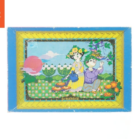 Dette puslespil består af 500 brikker og kommer i en farverig æske med illustrationer af personer i en pastoral scene. Æsken har en ramme med lilla og gul dekorative detaljer. Puslespillet er tegnet af Bjørn Wiinblad og er en del af en samling til Irma. De enkelte brikker viser en kompleks mosaik af farver og vil danne det komplette billede vist på æskens forside.