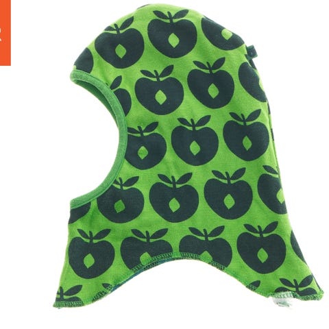 Denne vendbare elefanthue til børn er størrelse 98 og er lavet af blødt materiale. Huen har et grafisk mønster med æbler i forskellige nuancer af blå og grå på den ene side, og grå nuancer på den anden. Den er designet til at holde barnets hoved og hals varme. Huen er udstyret med en praktisk pasform, der beskytter mod kulde og vind.