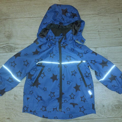 Børnejakke med hætte og lynlås foran. Jakken er primært blå med lyseblå kontrastfarver på ærmerne. Den har refleksstriber rundt om ærmerne og elastiske manchetter.