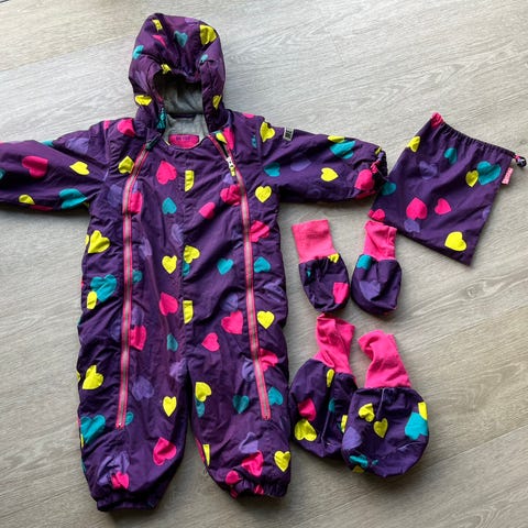 Soveheldragt til babyer med lange ærmer. Dragten er hvid med et mønster af små dyr, herunder får, på hele overfladen, samt lukkes foran med trykknapper. Der er bløde fødder uden synlige sko eller sokker.