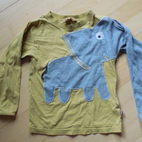 En langærmet grå bluse med et stort print af en elefant på forsiden. Blusen har trykknapper ved skulderen for nem påklædning. Den er lavet af et blødt materiale og er egnet til børn. Blusen har et mærke synligt på forsiden ved venstre side.