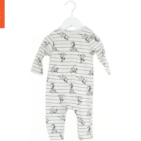 En grøn heldragt med lange ærmer og ben. Dragten har et trykt mønster med pandabjørne over hele stoffet. Der er en lynlås foran, som løber fra halsen ned til benene, hvilket gør det nemt at tage dragten af og på.