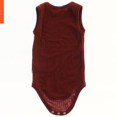 En blå bodystocking med korte ærmer og rund hals. Den har knaplukning ved bunden og sidesømme. Der er en lille farvet detalje på venstre side nær bunden.