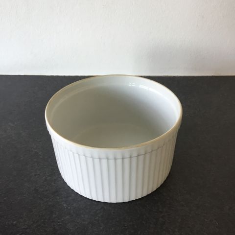 Denne skål er lavet af keramik og har en diameter på 10 cm. Den har en hvid farve med en dekorativ blå og beige kant med mønstre. Skålen er ideel til servering af mindre portioner. Skålens bund viser en trykt manufaktur mærkning.