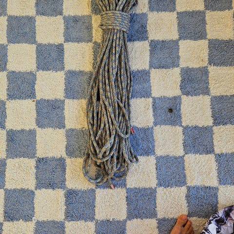 Klatrebremse med metallegeme og en grøn gummisnor. Den har en kompakt design med åbninger for klatretovet. Ideel til sikkerhed under klatring.