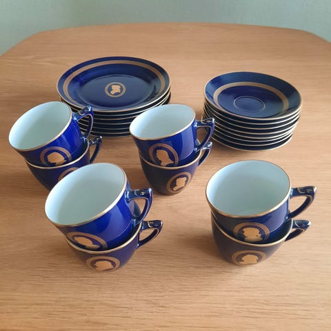 Dette er et sæt af 5 blå kaffekopper med gyldne profiler samt 5 tilhørende undertallerkener. Kopperne har en diameter på 8 cm, og undertallerkenerne har en diameter på 13,5 cm. Designet inkluderer en silhuetdekor af komponist som fx Bach & Beethoven på hver kop.