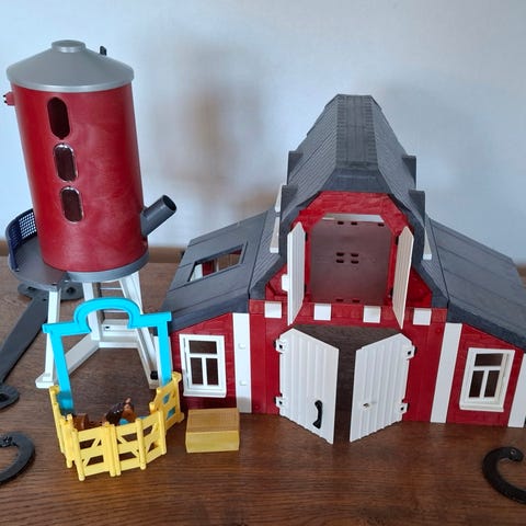 Komplet sæt af legetøjs bondegård med flere bygninger og tilbehør. Sættet inkluderer en detaljeret bondegårdshus, stald og forskellige mindre bygninger som skure, samt farverige plastdele til at bygge og indrette gården. Pakken leveres med instruktioner i form af et hæfte for montering og leg. Alle delene kommer i en kasse til opbevaring, hvilket gør det nemt at organisere og transportere legetøjet.