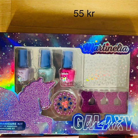 Martinelia Galaxy Dreams Manicure Kit inkluderer tre forskellige farver af neglelak, en neglefil, stickers til dekoration og tåskillepuder. Sættet er designet til at give dig mulighed for at eksperimentere med neglelaksfarver og skabe kreative og sjove neglekunst. Emballagen har et farverigt og fantasifuldt design med unicorn tema.