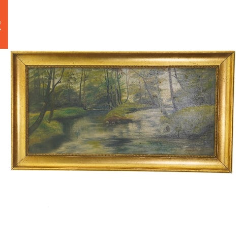 Dette er et maleri indrammet med en forgyldt ramme. Motivets primære tema er fugle i en skovagtig scene med et træ og grønne blade. Rammen er detaljeret med indviklede mønstre, der giver et antikt look. Bagsiden af rammen viser paneler til ophængning. Den samlede størrelse af maleriet med rammen er 28,5x23 cm.