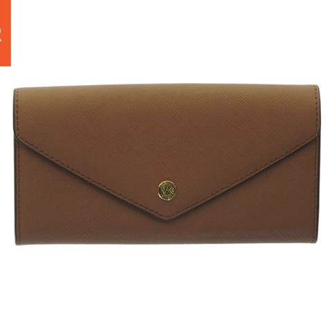 Den har en lynlås og en aftagelig rem, der gør den praktisk til håndledsbæring. På forsiden står 'MICHAEL KORS' i guldbogstaver.