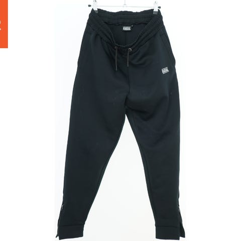 Træningsbukser i grå farve med elastisk talje og snøre. De har sidelommer og lynlåse nederst på benene.