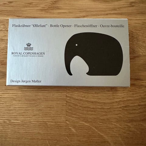 Flaskeåbner Ollefant i metal designet af Jørgen Møller. Produktet måler 6 cm i størrelse og kommer i original emballage fra Royal Copenhagen. Tags: flaskeåbner, Ollefant, Royal Copenhagen